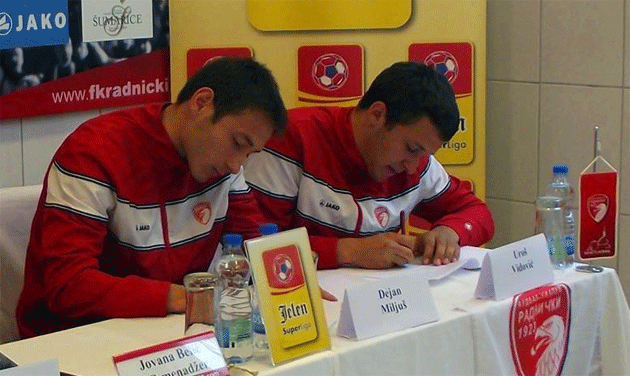 Fudbalski klub Radnički 1923 danas je potpisao prve profesionalne ugovore sa doskorašnjim članovima svoje omladinske škole, Urošem Vidovićem i Dejanom Miljušem.